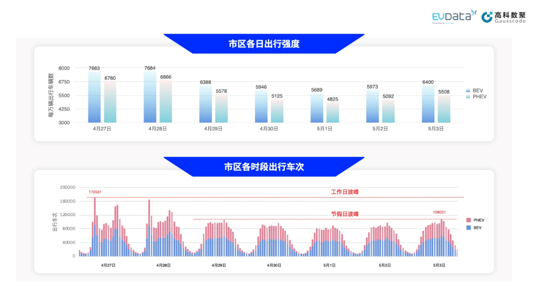 为更好体现新能源汽车在不同场景下的出行特征,五一期间新能源的出行数据将区分为市区出行和跨市出行分别进行展示[8]
